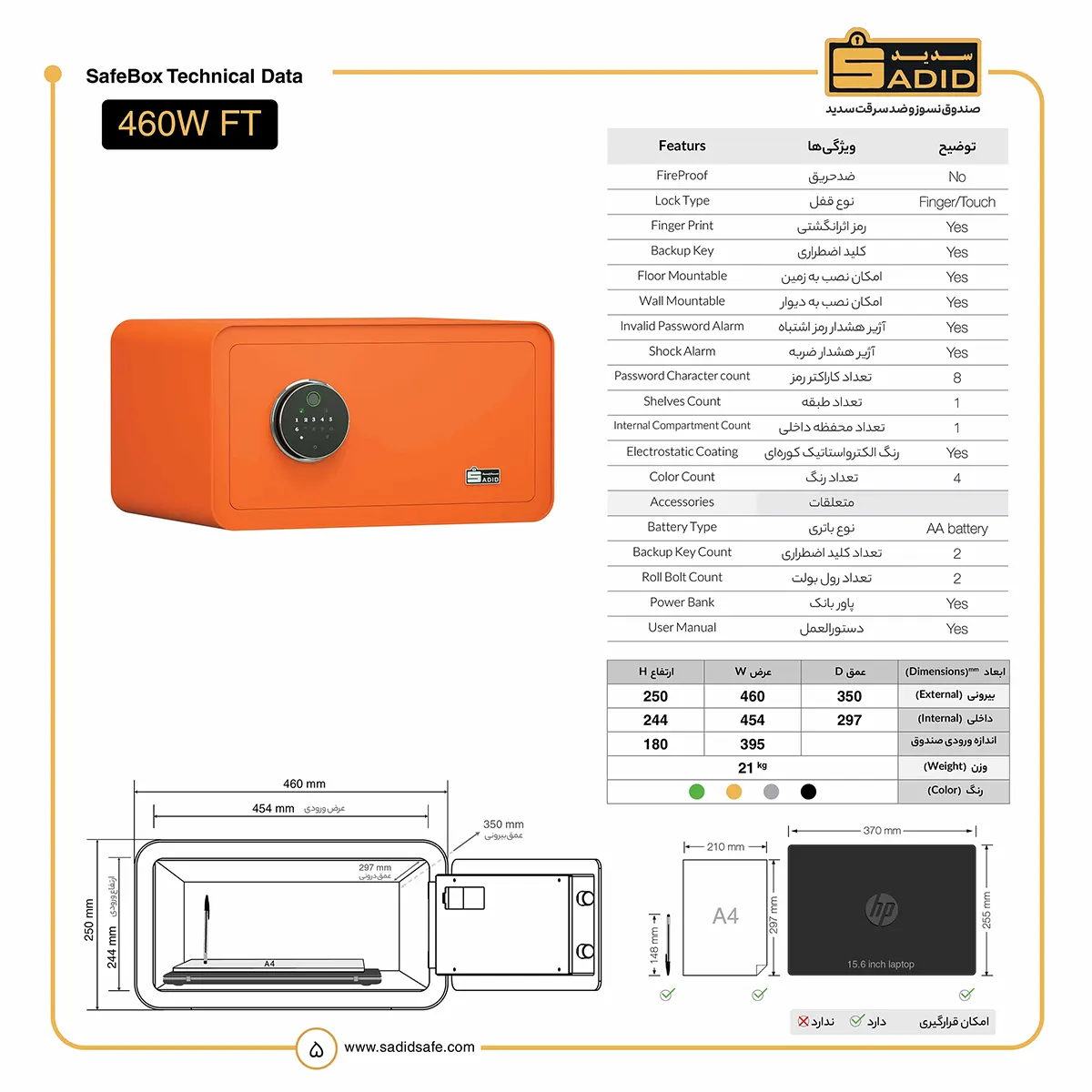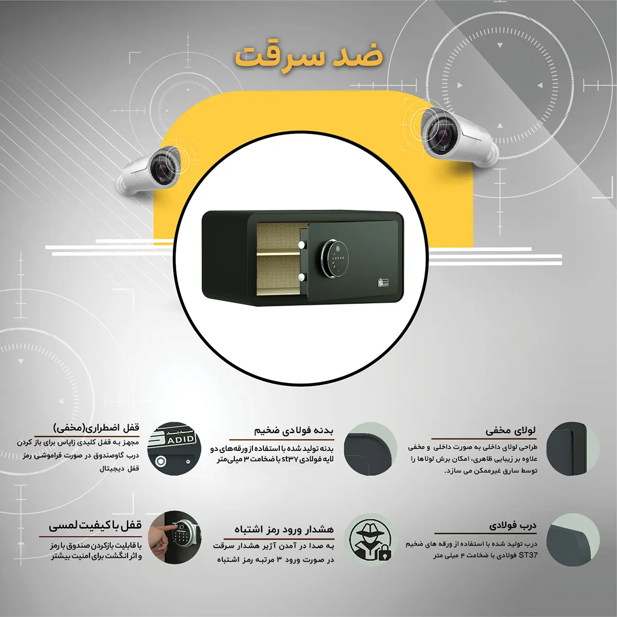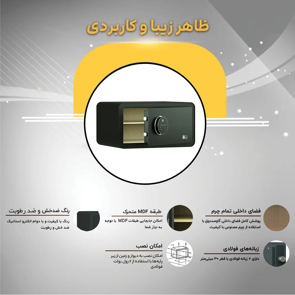 - دارای سنسور هشدار در صورت وارد شدن 3 مرتبه رمز اشتباه