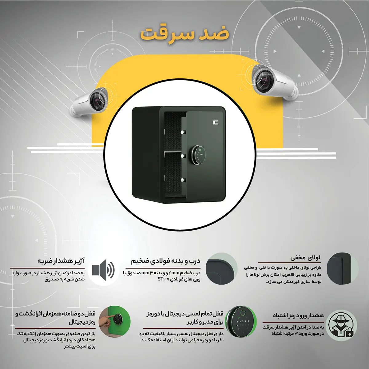 - دارای قفل دیجیتال ضد سرقت خزانه ای